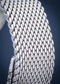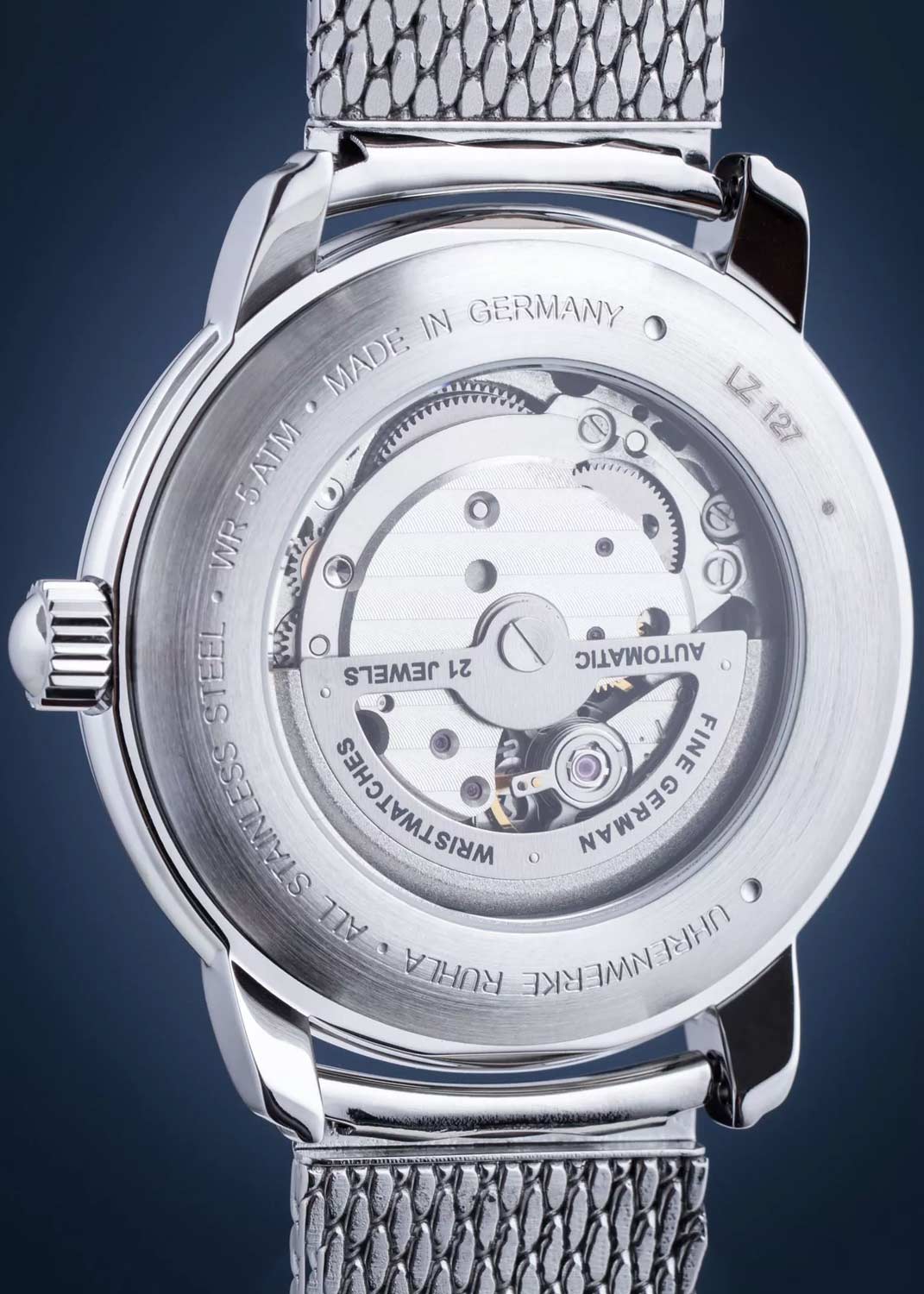 Рифленая заводная головка. Прозрачная задняя крышка. Браслет миланского плетения.