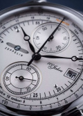 Корпус диаметром 42 мм выполнен из нержавеющей стали, защищён стойким к повреждениям минеральным стеклом K1. Светлый, почти серебристый циферблат оформлен крупными чёрными арабскими цифрами и снабжён тремя вспомогательными шкалами. Особое внимание привлекает комбинация тахиметрической и телеметрической шкалы — элементы, без которых невозможно представить часы 30-х годов прошлого века. Форма стрелок, деликатная насечка и лаконичная дата в положении «4 часа» придают модели законченность и визуальный баланс.