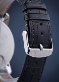 Рифленая заводная головка. Задняя крышка с гравировкой. Удобный кожаный ремешок с классической застежкой.