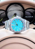 Циферблат с метками в виде штрихов защищен прочным сапфировым стеклом. Окошко даты находится в положении 3 часа. Заводная головка с защитой. Браслет с раскладывающейся застежкой.