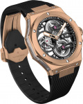 Циферблат с метками в виде точек защищен прочным сапфировым стеклом. Прозрачная задняя крышка с сапфировым стеклом крепится на 6-ти винтах. Ремешок с раскладывающейся застежкой.