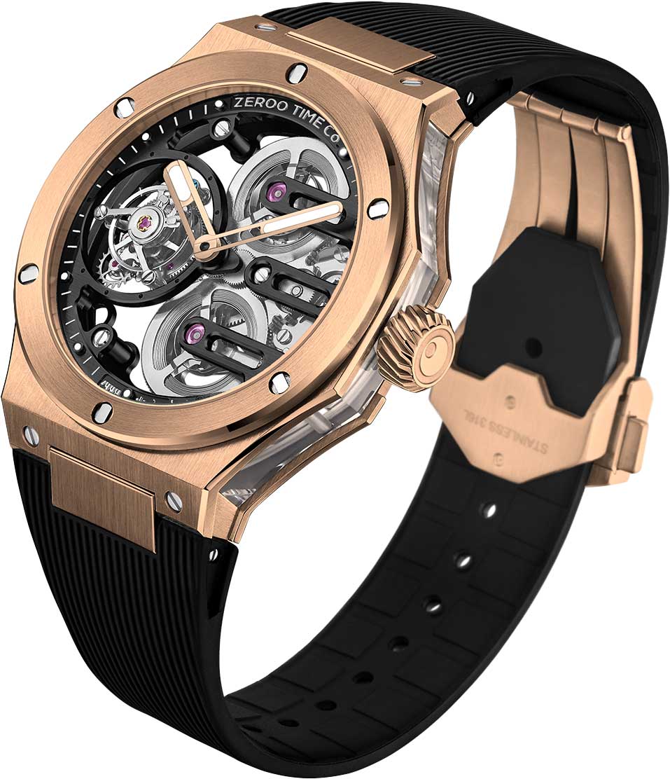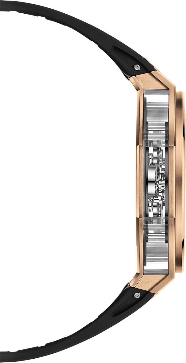Циферблат с метками в виде точек защищен прочным сапфировым стеклом. Прозрачная задняя крышка с сапфировым стеклом крепится на 6-ти винтах. Ремешок с раскладывающейся застежкой.