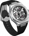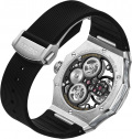 Циферблат с метками в виде точек защищен прочным сапфировым стеклом. Прозрачная задняя крышка с сапфировым стеклом крепится на 6-ти винтах. Ремешок с раскладывающейся застежкой.