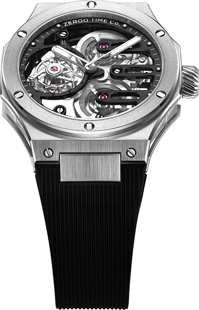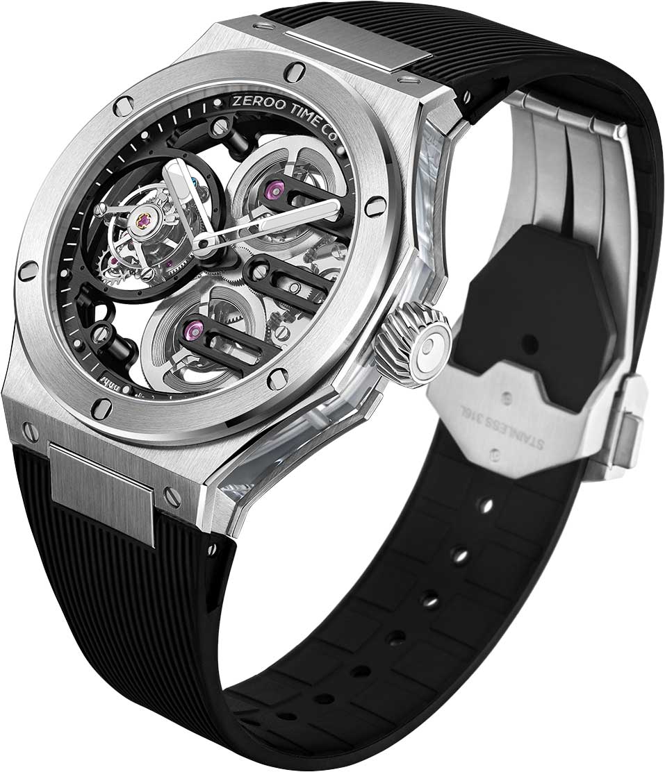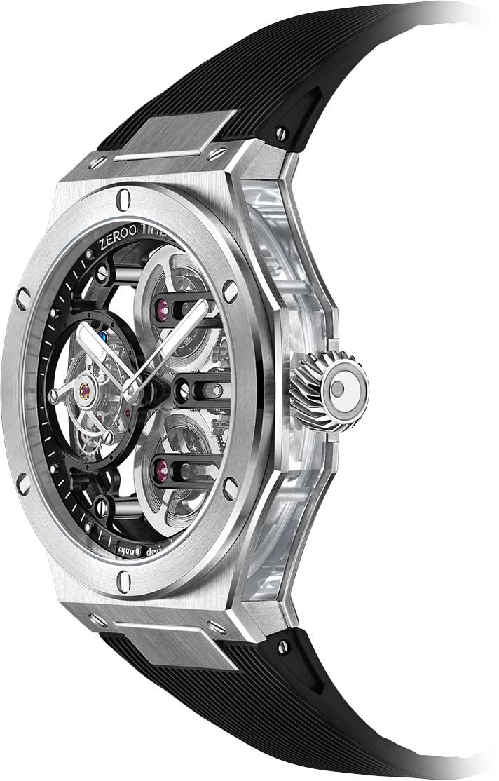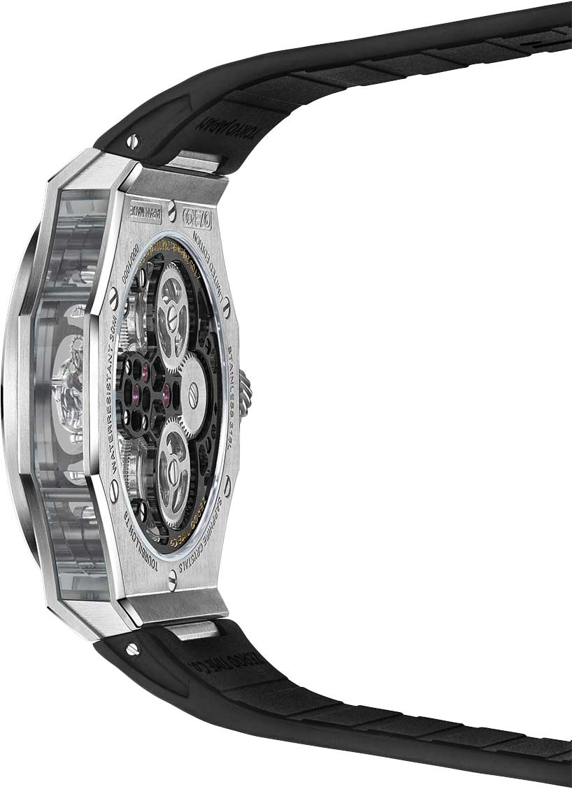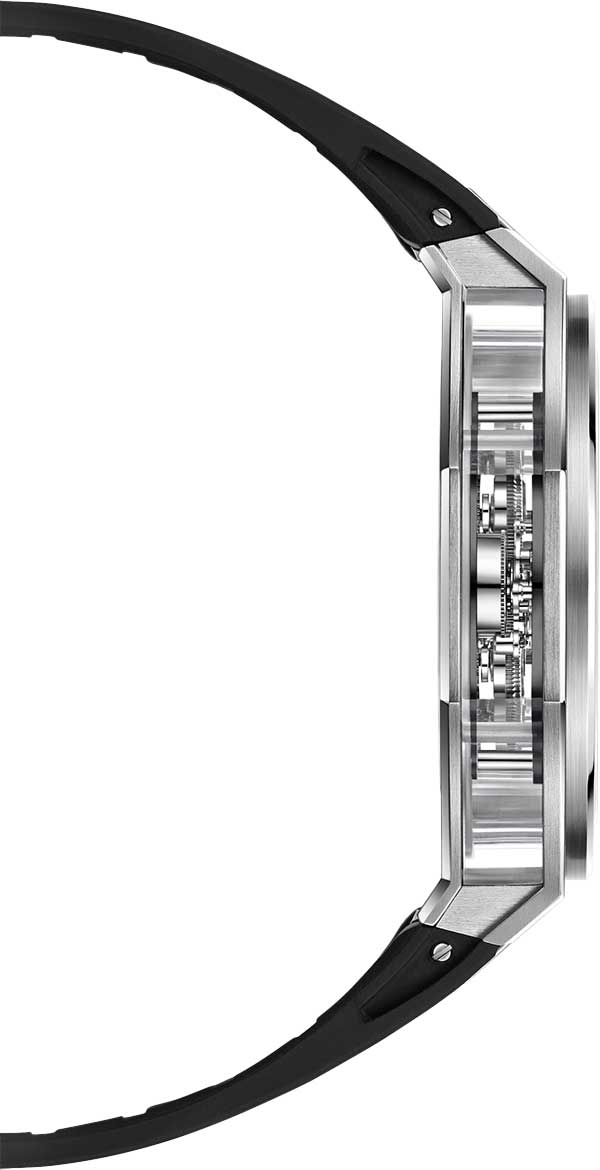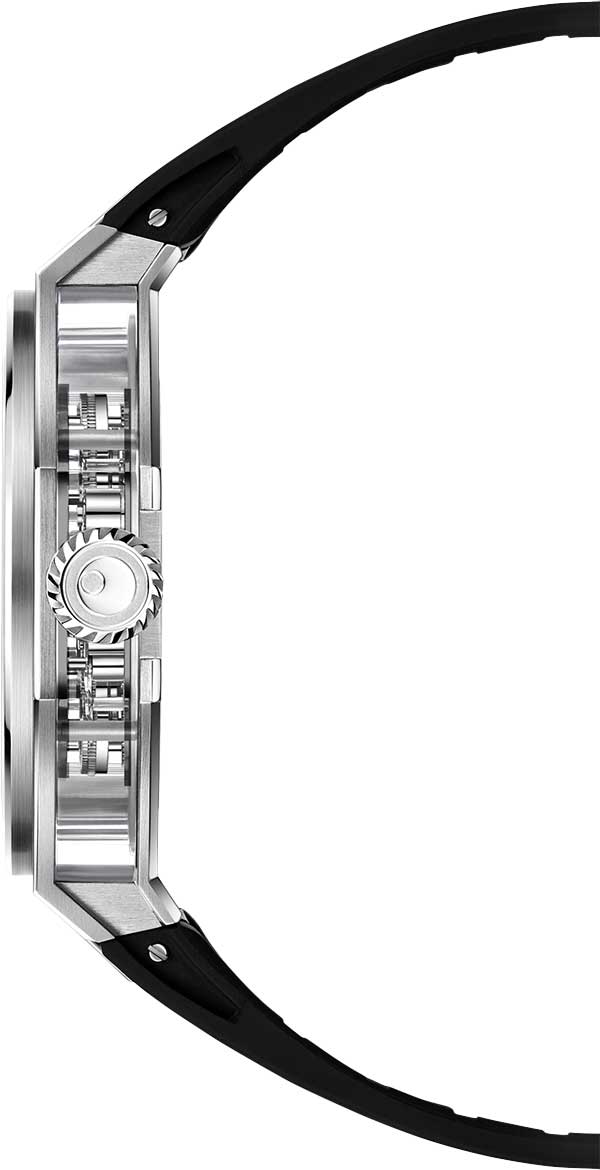 Циферблат с метками в виде точек защищен прочным сапфировым стеклом. Прозрачная задняя крышка с сапфировым стеклом крепится на 6-ти винтах. Ремешок с раскладывающейся застежкой.