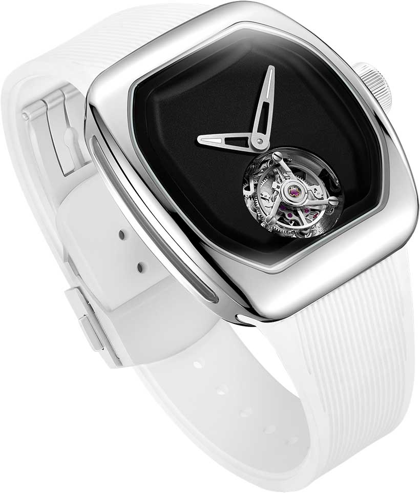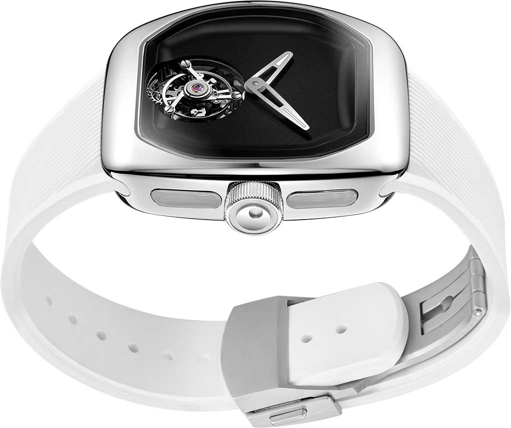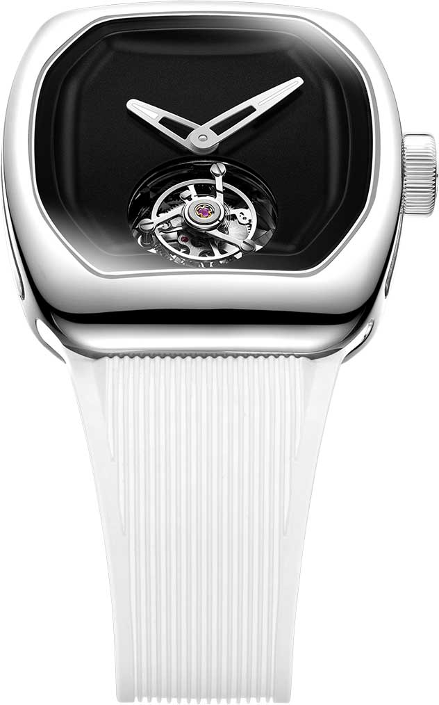 Циферблат защищен прочным сапфировым стеклом. Прозрачная задняя крышка с сапфировым стеклом крепится на 4-х винтах. Рифленая заводная головка. Ремешок с раскладывающейся застежкой.