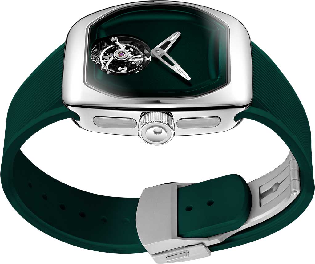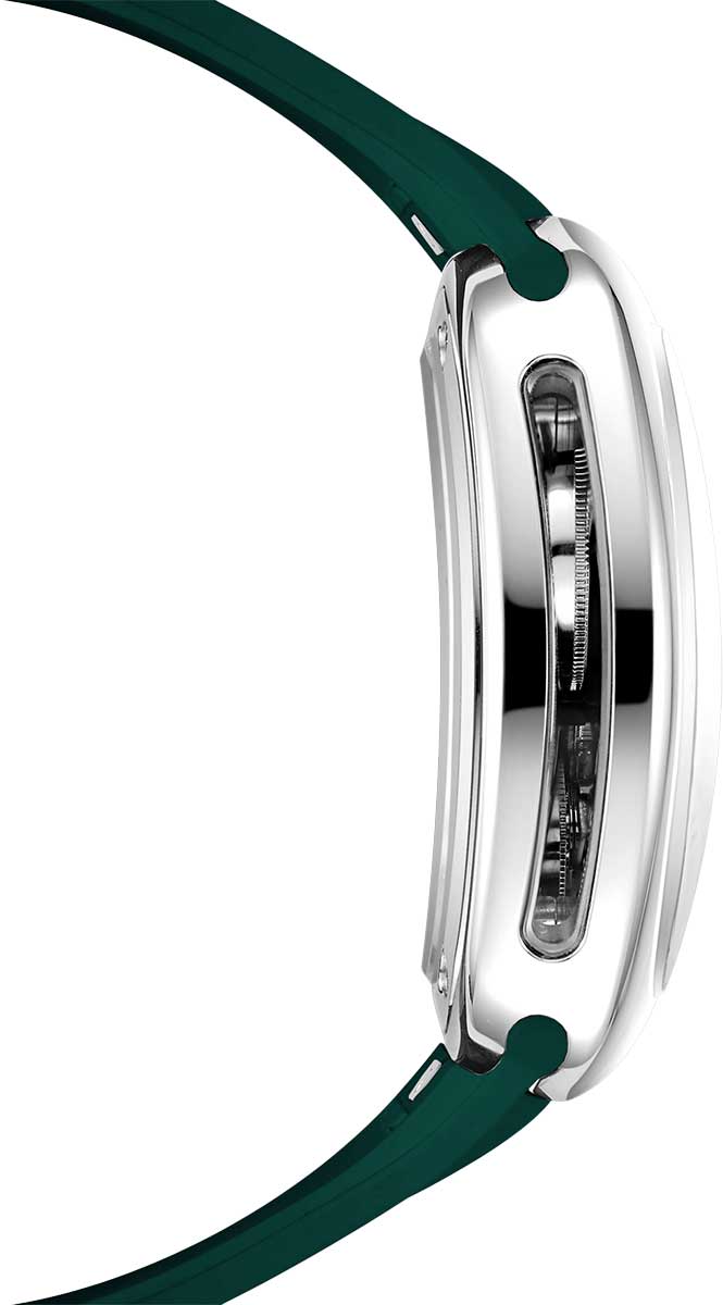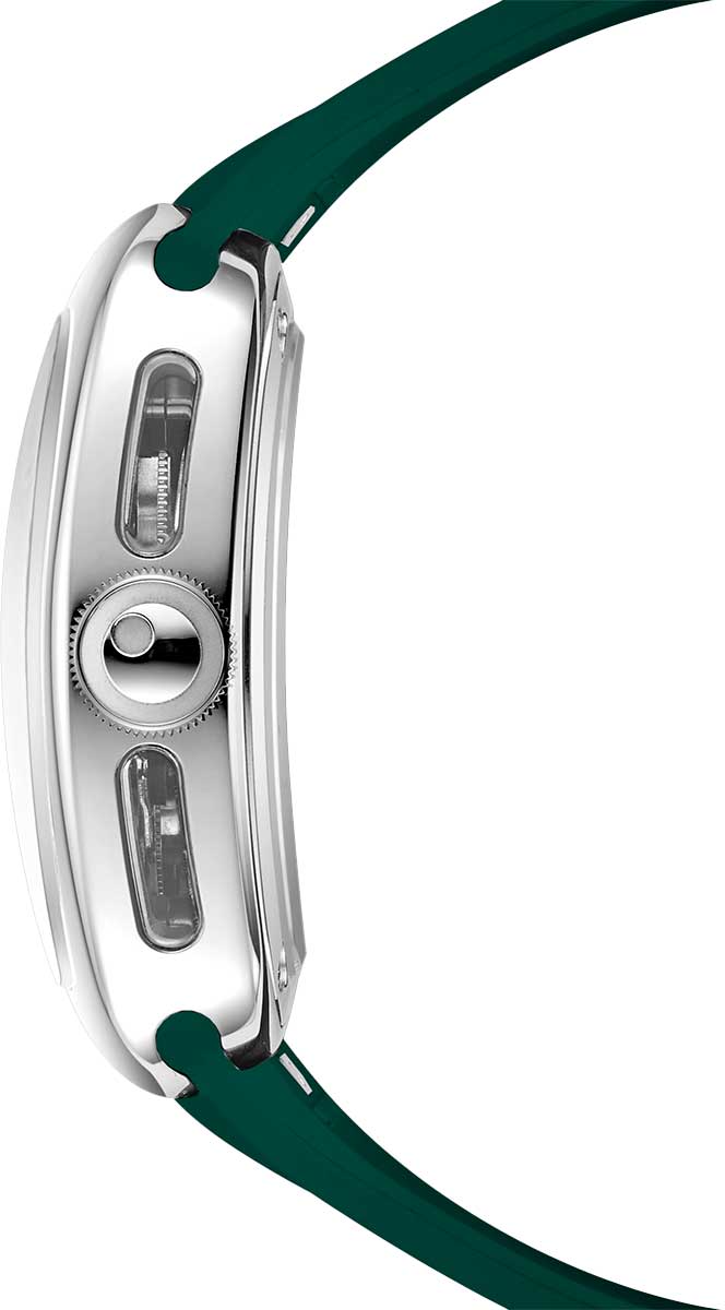 Циферблат защищен прочным сапфировым стеклом. Прозрачная задняя крышка с сапфировым стеклом крепится на 4-х винтах. Рифленая заводная головка. Ремешок с раскладывающейся застежкой.